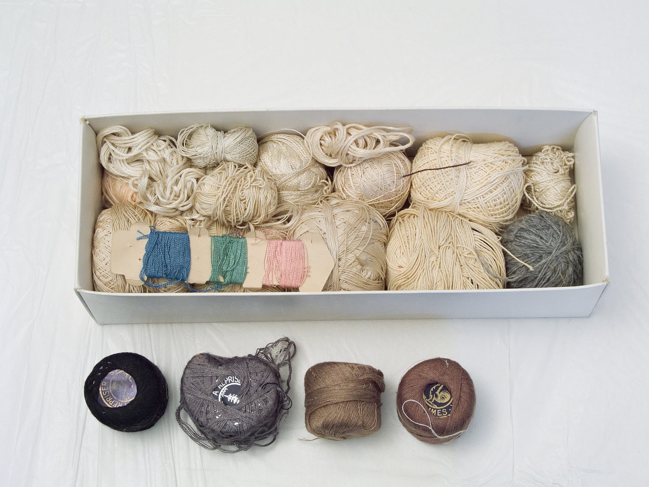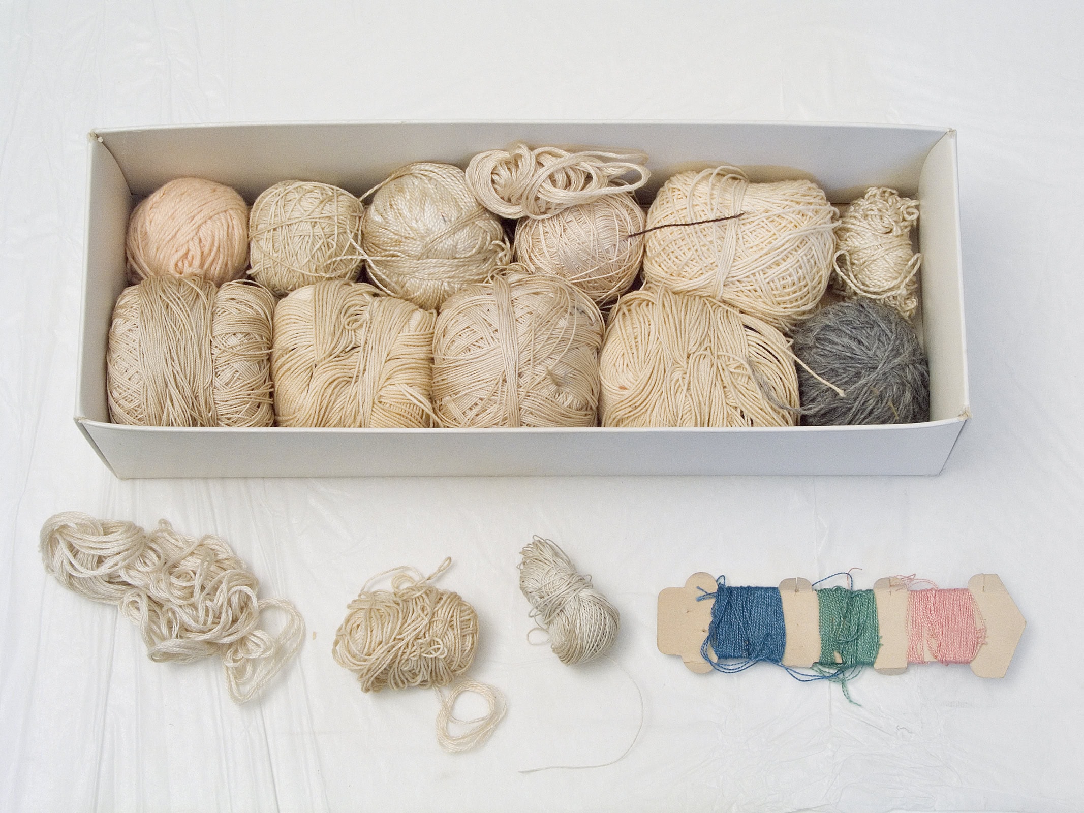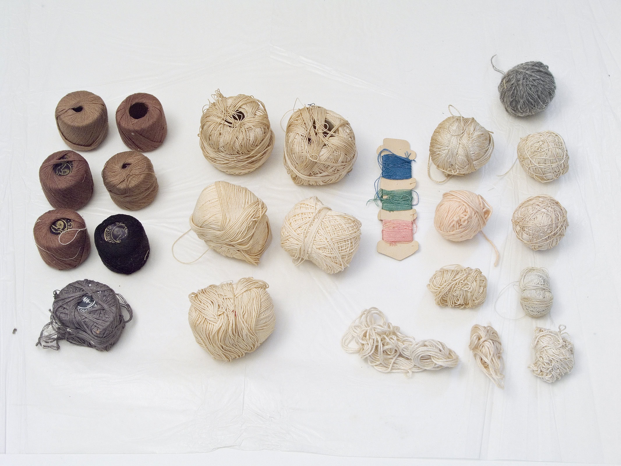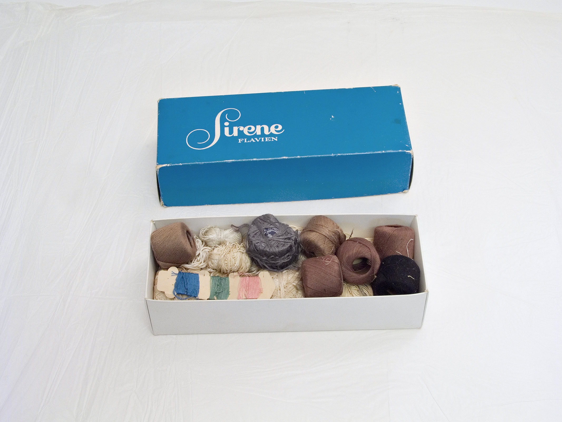Gabrielle a rangé soigneusement ses boîtes de fils de couture, de boutons-pression, de cercles à broder, de ficelles de bolduc. J’ouvre ces sarcophages bleus ou roses, déchiffre les inscriptions des couvercles, numérote les bobines et inventorie les pelotes. J’aligne toutes ces reliques, je les soupèse, je mesure leur longueur, leur diamètre, comme font les archéologues. On ne les étudiera pas dans une vitrine de musée, plutôt dans une photographie.