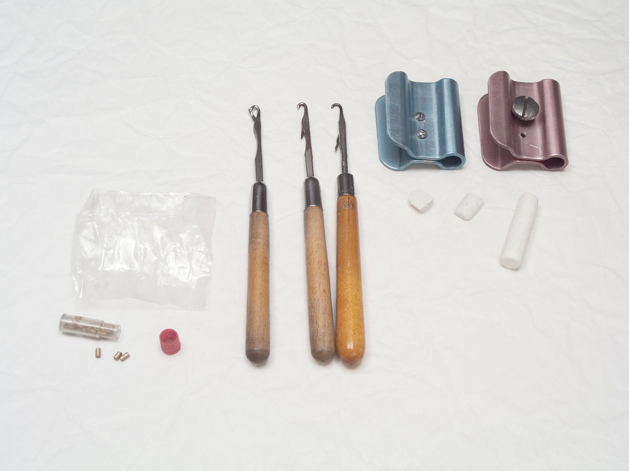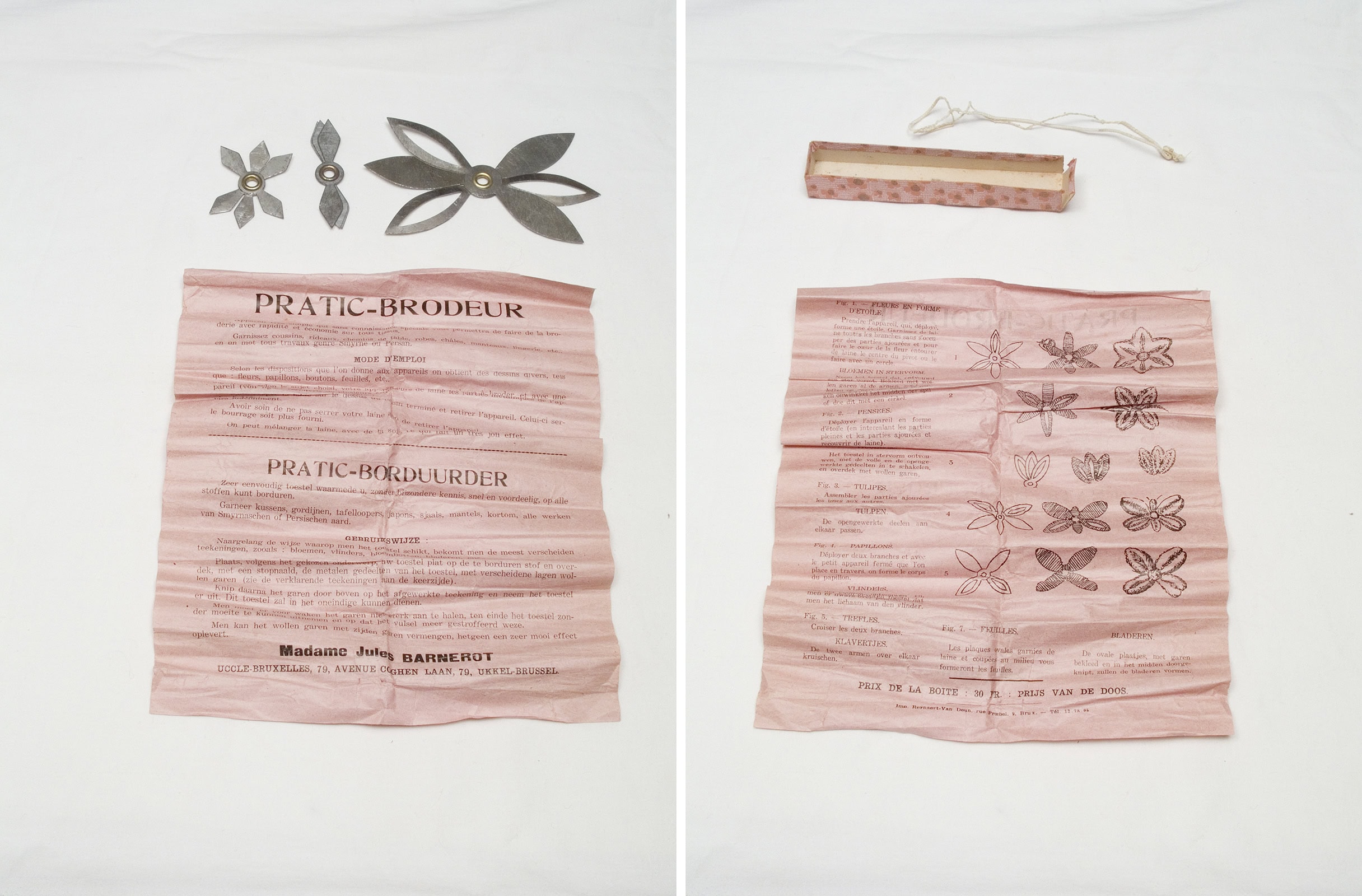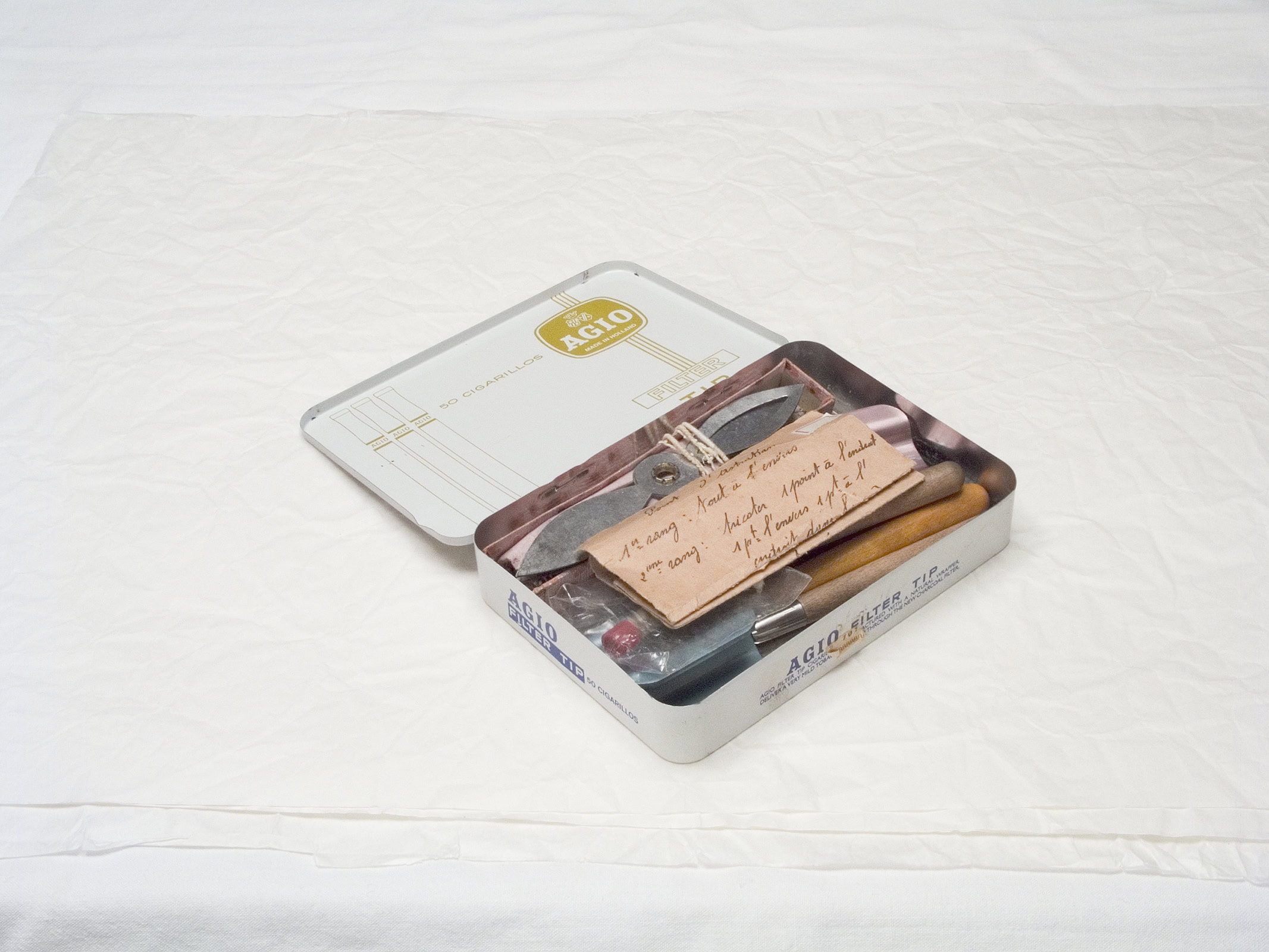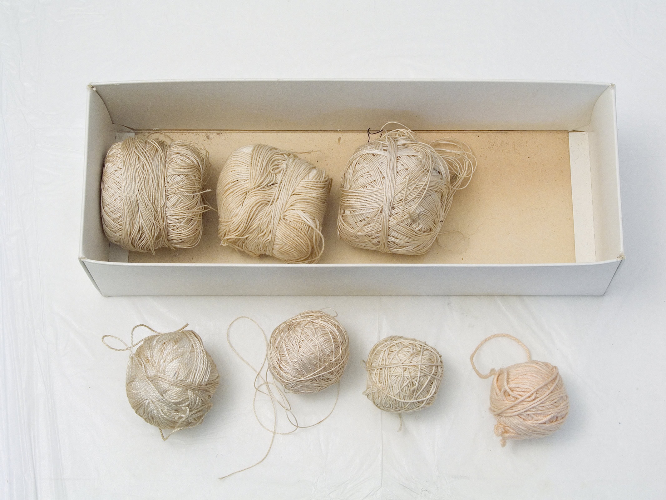 Gabrielle a rangé soigneusement ses boîtes de fils de couture, de boutons-pression, de cercles à broder, de ficelles de bolduc. J’ouvre ces sarcophages bleus ou roses, déchiffre les inscriptions des couvercles, numérote les bobines et inventorie les pelotes. J’aligne toutes ces reliques, je les soupèse, je mesure leur longueur, leur diamètre, comme font les archéologues. On ne les étudiera pas dans une vitrine de musée, plutôt dans une photographie.