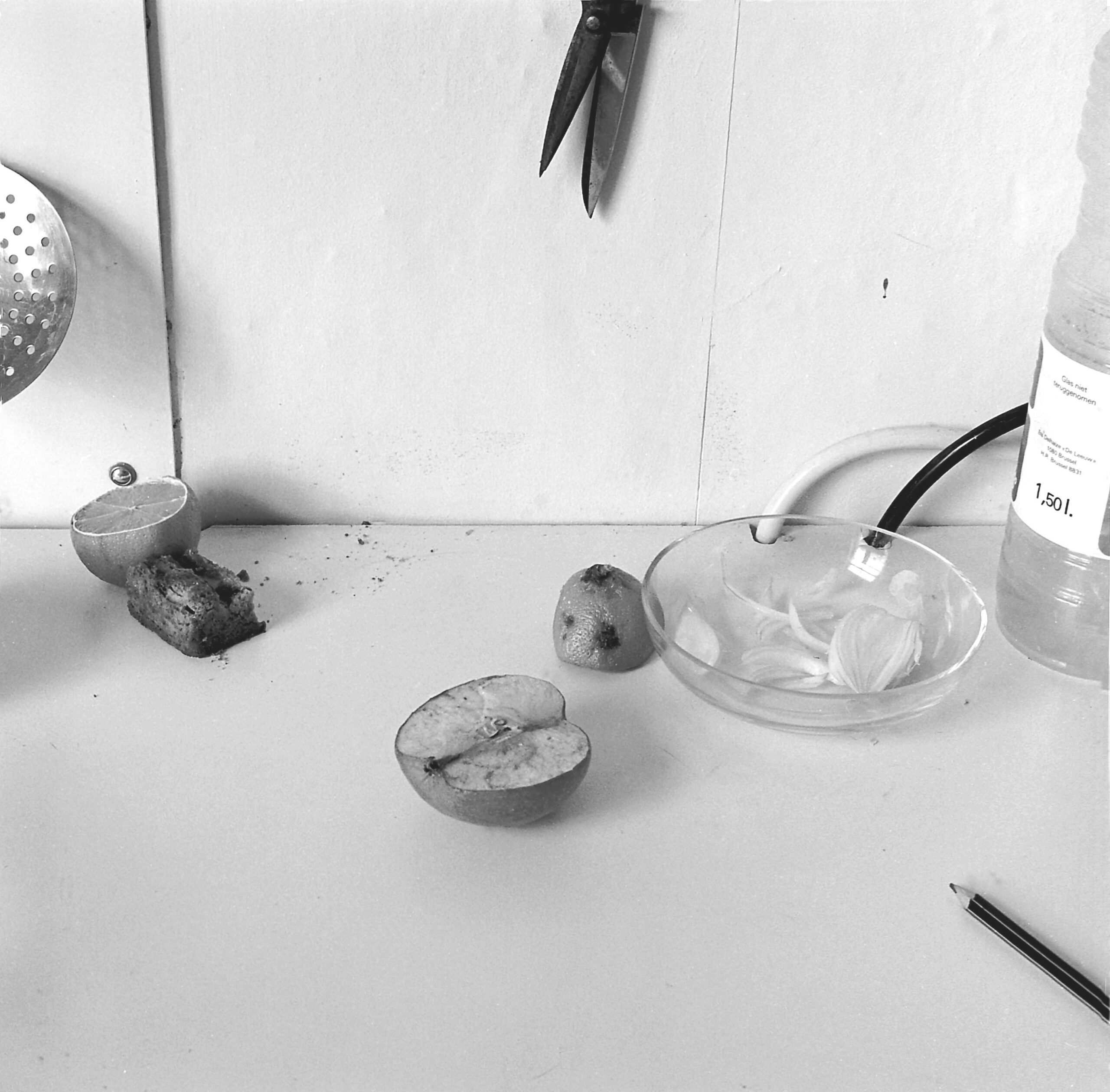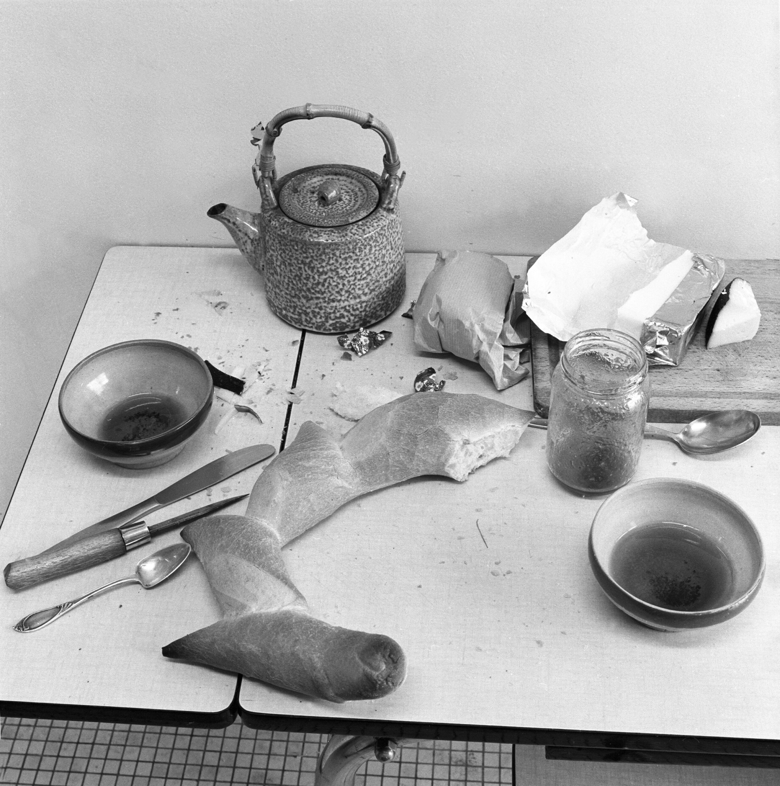 J’ai photographié le paysage qui m’entoure: la table de mon petit-déjeuner, puis la tablette voisine, l’étagère, … Aussi intrigants pour moi que les grands espaces de la nature verdoyante, que je ne me lasse pas de recueillir sur ma pellicule sensible. Comment diable ces choses sont-elles là devant moi ? Qui les y a placées, déposées? Et par quel geste distrait ou conscient ?